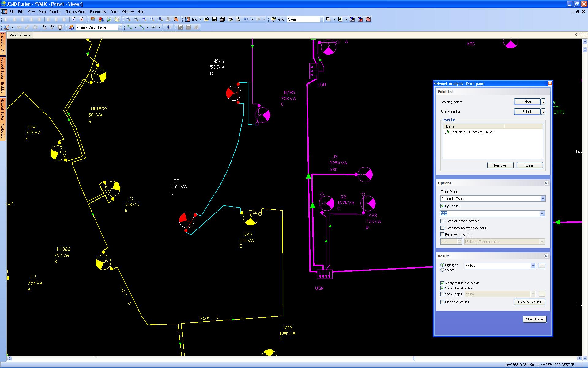 Highlighted trace results (yellow and purple) identifying a de-energized section (light blue and red).