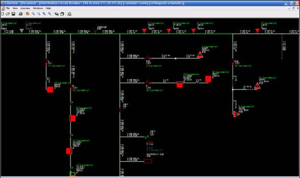 This LineView Theme is a schematic view with customer counts by phase displayed on circuit breakers.